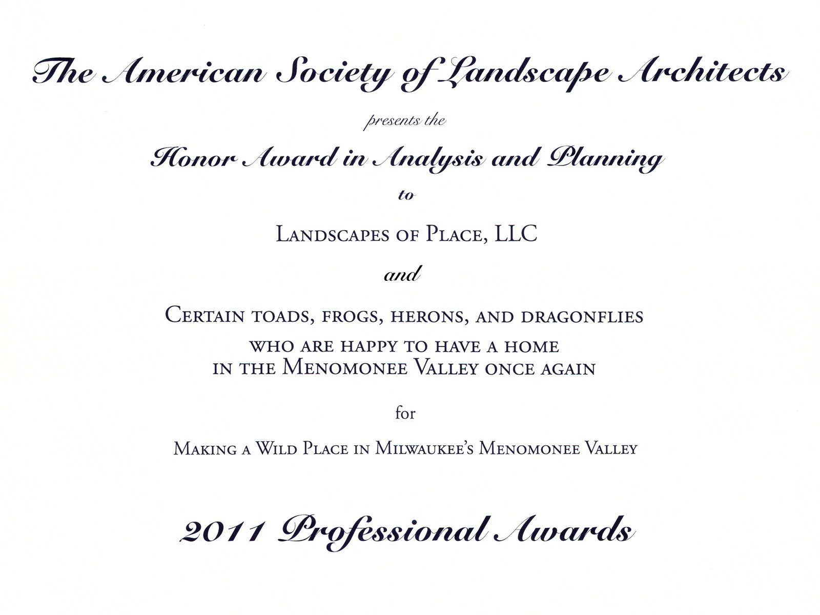 Last week, my partner Dan and I were awaiting the walk across the stage in San Diego to receive our national award from the American Society of Landscape Architects, for our detailed plans for the restoration of a half-mile of the urban Menomonee River Valley.