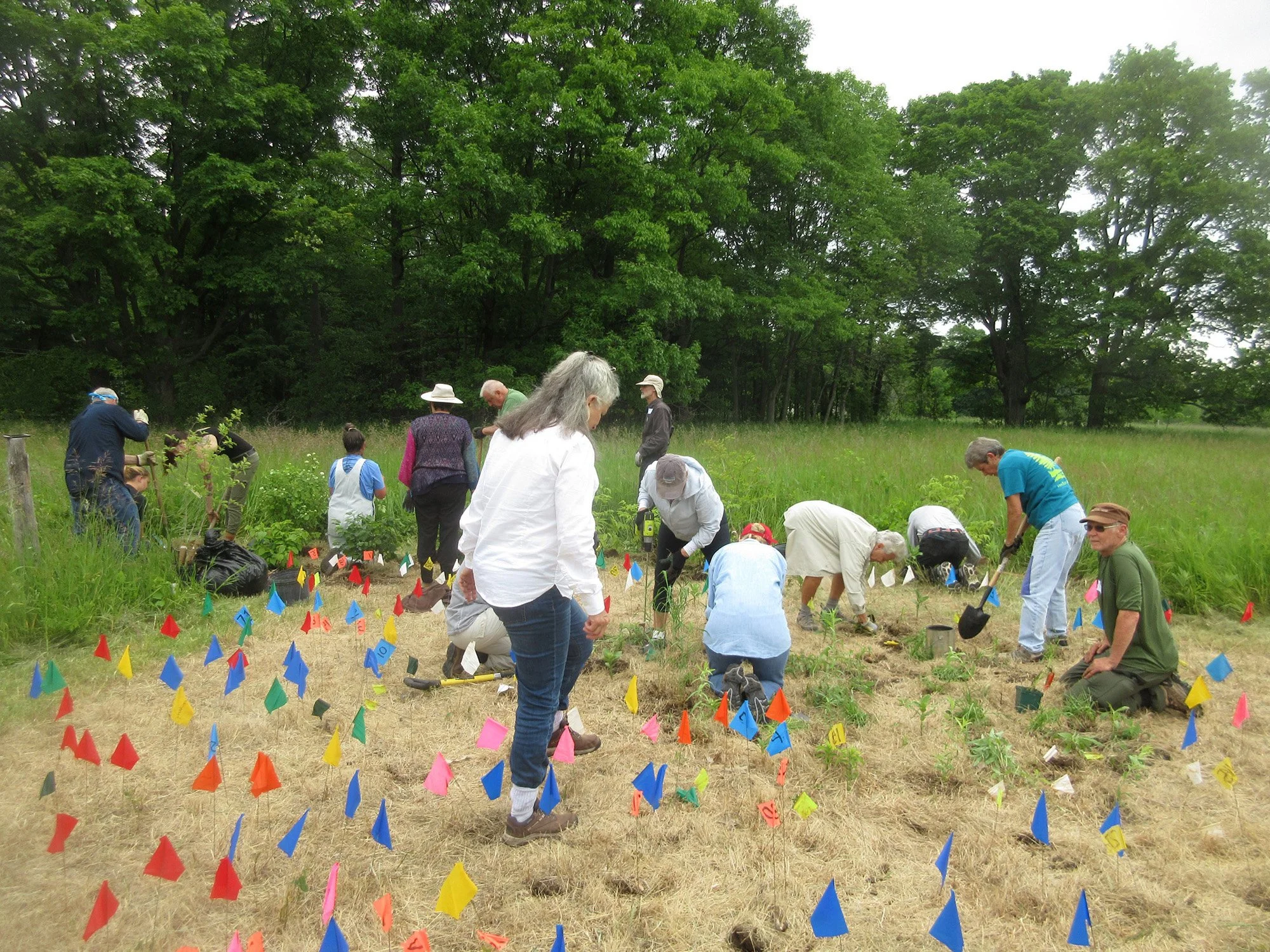 It was a glorious day June 24th for hard-working neighborhood volunteers, the Door County Land Trust and Bay Shore Property Owners Association to plant a demonstration garden at DCLT’s Bay Shore Blufflands Preserve lower trailhead. We planted 700 native herbaceous plants for a pollinator meadow and 40 native shrubs for a braided hedgerow, to demonstrate great options for homeowners in replacing the invasive exotic buckthorn and invasive exotic honeysuckle. We are watching it grow and happy for recent rain. Thank you especially to Denice and Ken for your support.