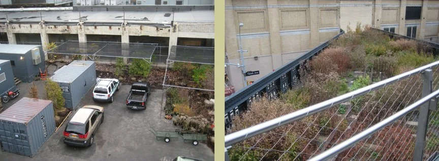 Things to love at the High Line – unexpected treasured spots, like this spur (right)… But my favorite has to be the NYC Parks trailer offices, stewardship gear and onsite nursery at the south end (left), right under the High Line.